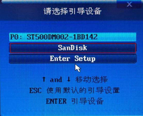 注意下图:这里的启动优先权1是:PO:ST500的硬盘。我们回车,然后选择SanDisk的闪迪U盘,并回车。